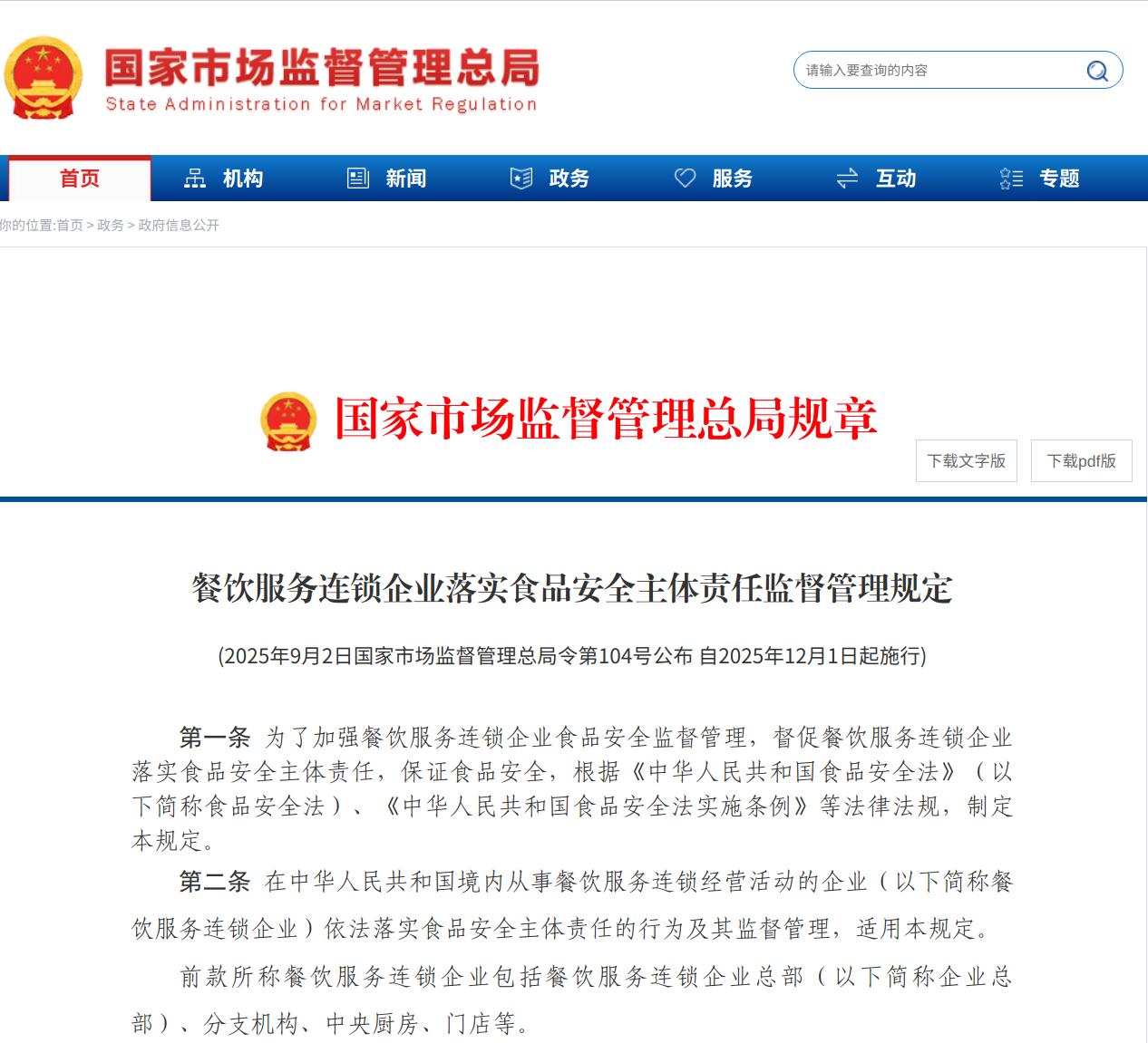 西贝、海底捞、杏花堂、喜茶、一点点……现正在出去吃饭,商场里同一粉饰、同一菜单、同一办事的连锁店越来越多了。数据显示,我国餐饮连锁化率已从2020年的15%提拔至2024年的23%,行业规模化历程显著加快。然而,行业的快速成长也出“沉扩张、轻办理”的矛盾。现实中,部门企业过度逃求门店数量,却疏于对终端门店特别是加盟店的本色性办理,导致“总部管不了门店”“出事立即甩锅”,办理义务悬空,食物平安底线失守,不只了消费者信赖,更着行业全体的诺言基石。连锁模式的焦点正在于尺度化取可复制,更必需贯穿于食物平安这终身命线。当同一的招牌挂起来,同一的办理轨制可否实正落地,已成为决定行业健康成长的环节。这一行业痛点,近日市场监管总局发布《餐饮办事连锁企业落实食物平安从体义务监视办理》,把总部和分支机构以及门店的义务慎密毗连起来,进一步锁定食物平安。