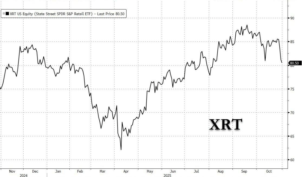 高盛Delta One部分担任人Rich Privorotsky指出,这种分化正在最新财报季中表示得尤为较着:苹果强劲的假期瞻望凸显高端消费者实力,但餐饮和中端非必需消费品类股价暴跌,零售ETF XRT已回落至10月中旬低点。